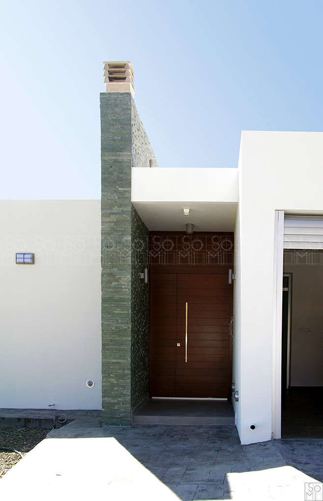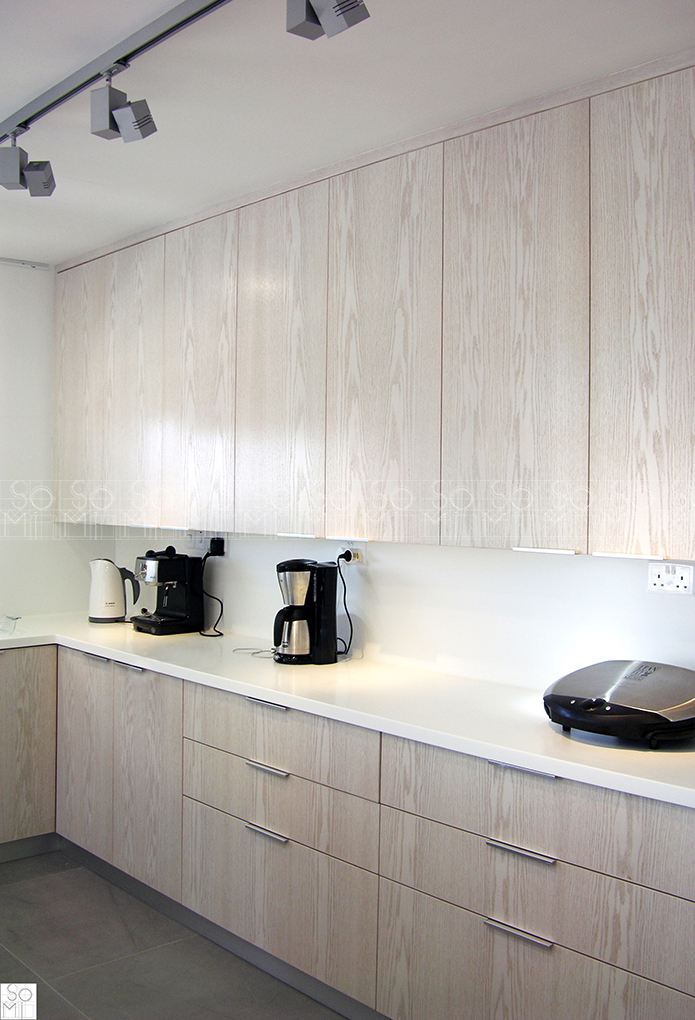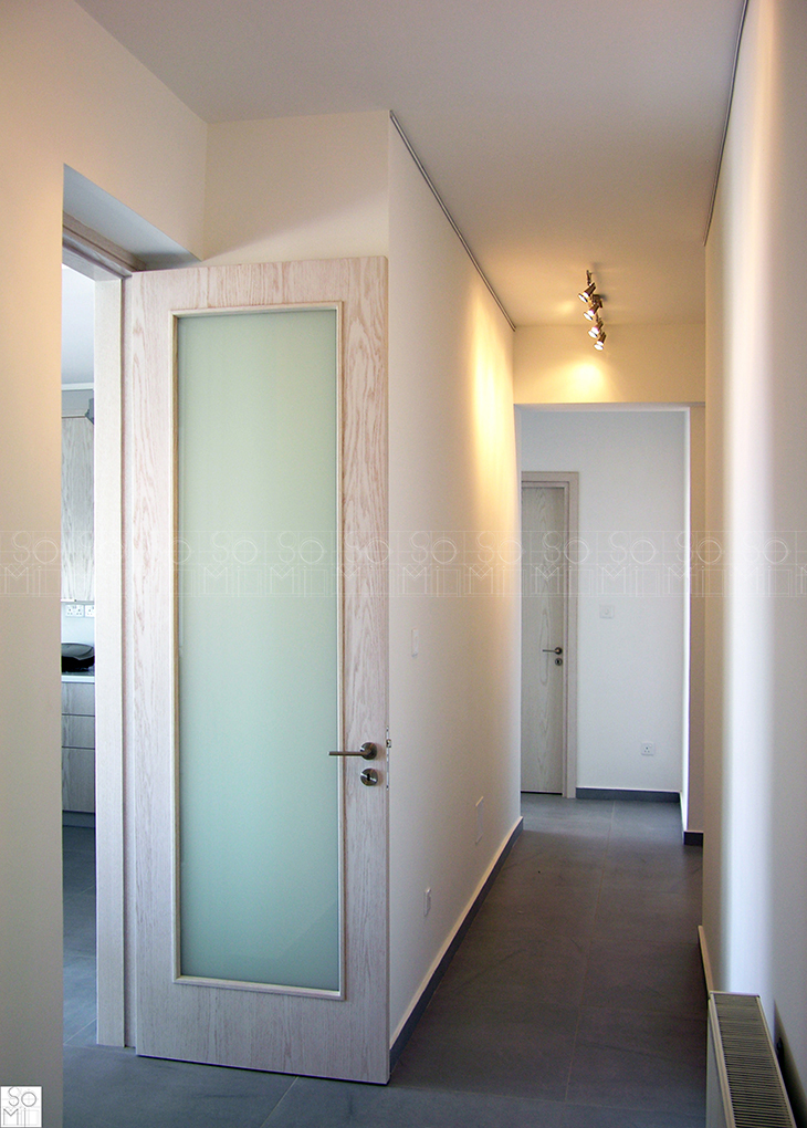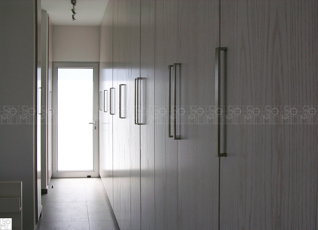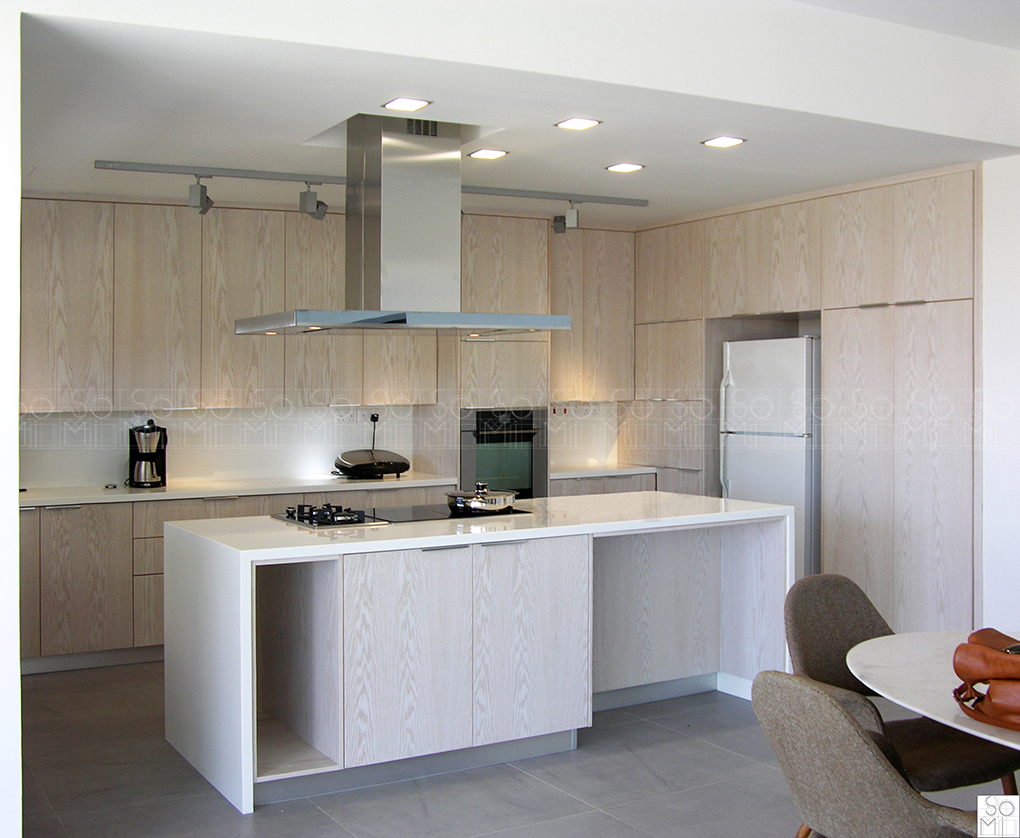Minimalistic lines, large surfaces, white-wash oak and a touch of aluminum were used to complete the modern essence in this private residence. The main door is divided into two uneven panels for maximum utility. The kitchen has most of its walls covered with long cupboards allowing extended surfaces and a dominant island.